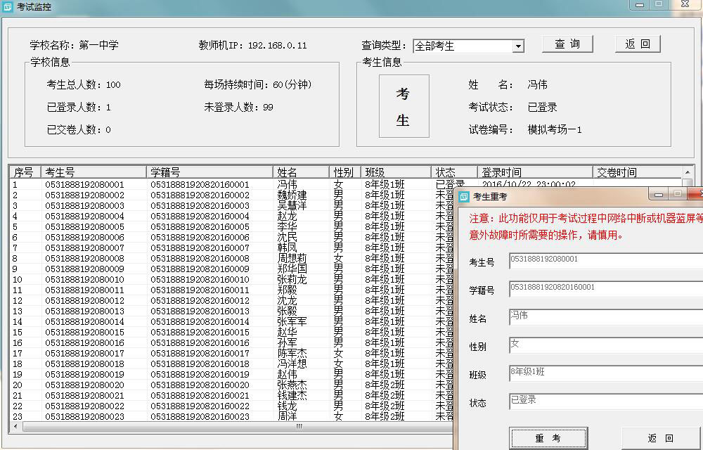開(kāi)始考試后,可進(jìn)入考試監(jiān)控頁(yè)面,考生的所有操作和狀態(tài)一覽無(wú)余,方便教師充分了解每個(gè)學(xué)生的掌握程度。單擊考生信息所在行,右上角顯示當(dāng)前考生的詳細(xì)信息,雙擊考生信息所在行,可對(duì)該考生進(jìn)行重考操作。 開(kāi)始考試后,可進(jìn)入考試監(jiān)控頁(yè)面,考生的所有操作和狀態(tài)一覽無(wú)余,方便教師充分了解每個(gè)學(xué)生的掌握程度。單擊考生信息所在行,右上角顯示當(dāng)前考生的詳細(xì)信息,雙擊考生信息所在行,可對(duì)該考生進(jìn)行重考操作。
